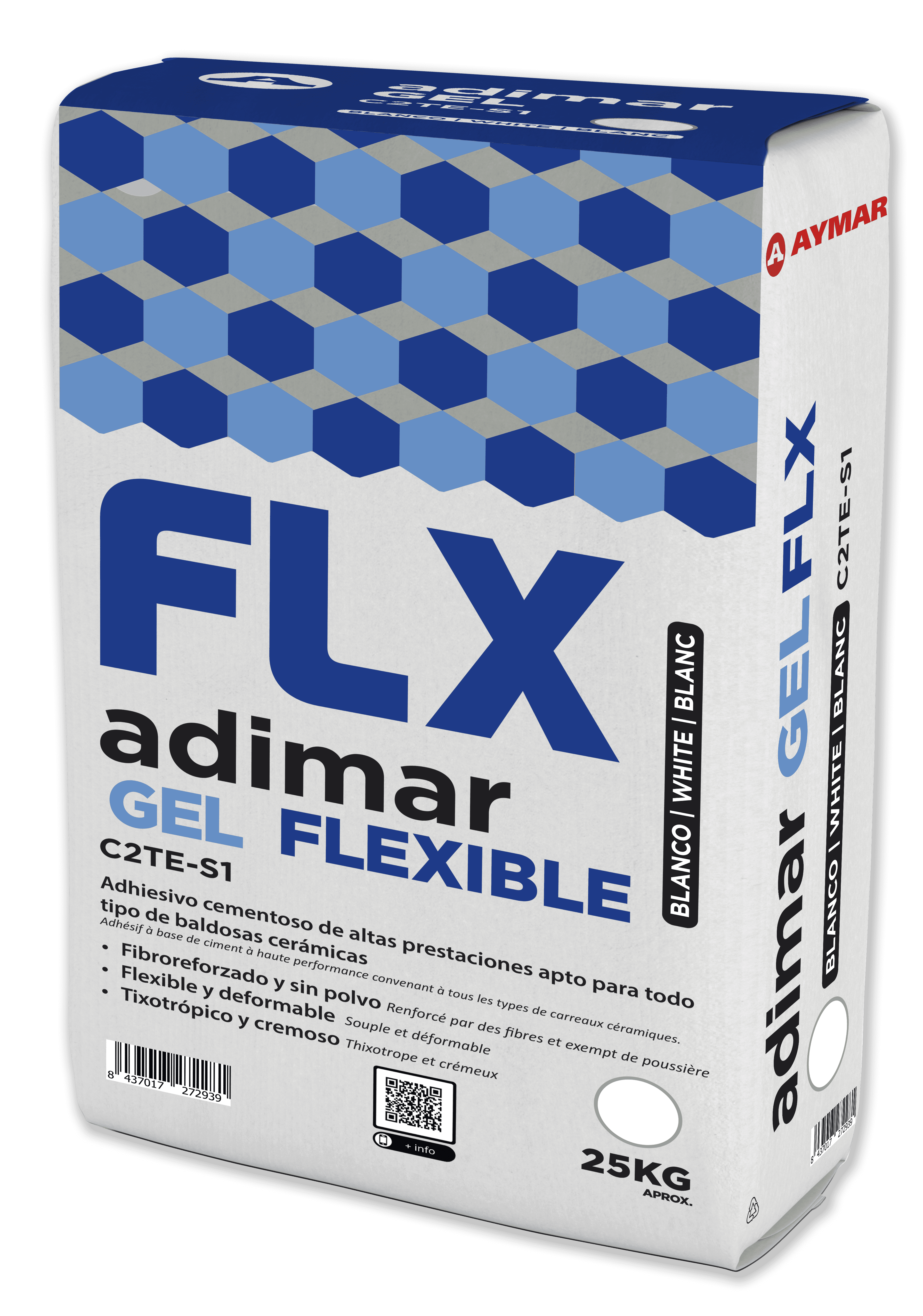 The Adimar Flexible Gel ceramic tile adhesive manufactured by AYMAR S.A.U. is an improved powder-free cementitious adhesive reinforced with polymeric fibres. It has a finer granulometry that allows for better distribution on the substrate. Depending on the mixing water, it has the capacity to have two types of consistency: gel consistency (creamy, light and thixotropic for vertical application) and fluid consistency (with greater smoothness and ease of application on horizontal substrates). It has reduced slip, prolonged open time and is deformable type C2TES1 in accordance with the UNE-EN 12004:2017 standard, designed with marble aggregates, cement and special additives that give it a high resistance to sagging and settling in pieces of large format or weight. In addition to adhesion, sliding and water retention suitable for laying ceramic tiles.