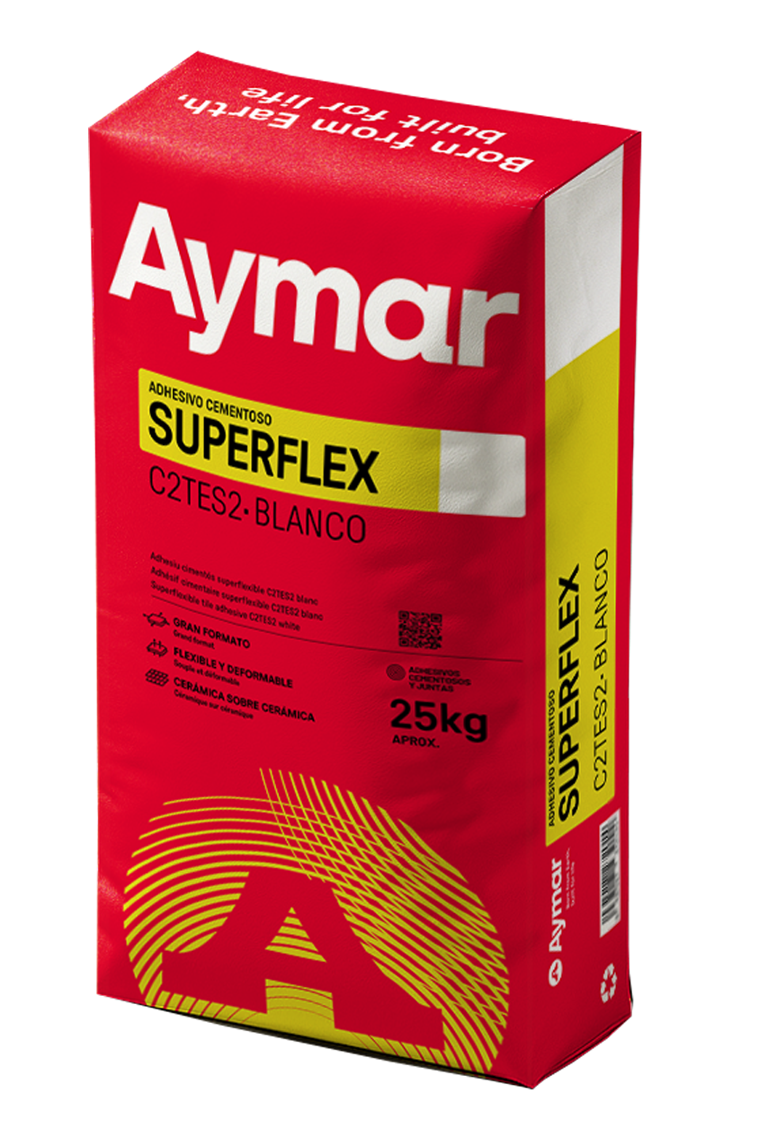 L'adhesiu per a rajoles ceràmiques SUPERFLEX, que subministra AYMAR SAU, és un adhesiu de ciment monocomponent d'altes prestacions, dissenyat, desenvolupat, fabricat amb àrids de marbre seleccionat, ciment, resines sintètiques i altres additius molt específics que li confereixen unes excel·lents propietats d'adherència així com una alta flexibilitat i un lliscament inapreciable. Especialment indicat per a la seva utilització en capa fina, per a materials ceràmic de baixa absorció i gran format, per a façanes, paviments de trànsit intens i sòls amb calefacció radiant.